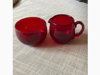 Till Jul! Monica Bratt. Djupröd gräddkanna och sockerskål Reijmyre vintage .