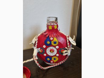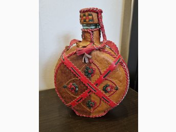 Läderklädd butelj, flaska. Samiskt hantverk.
