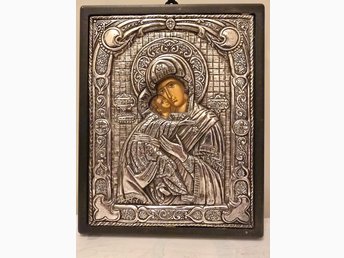 Bysantinsk handgjord ikon i silver 950 - Jungfru Maria med Jesusbarnet
