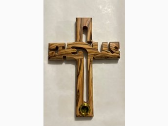 Kors med Jesus namn graverad. Olivträ. Hantverk från Betlehem