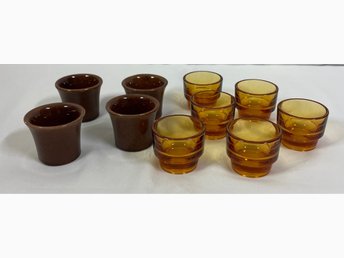 Bo Fajans - 4 Äggkoppar Brun keramik - 6 Bärnstensfärgade Äggkoppar Glas -
