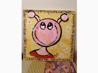 Pall, målad i i svart och grått och med kalligrafi från Ylva Skarp, signerad