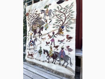 Stor Kraftig Vävnad Bildvävnad Handgjord Hantverk Ull Figural 206x122 cm Vintage
