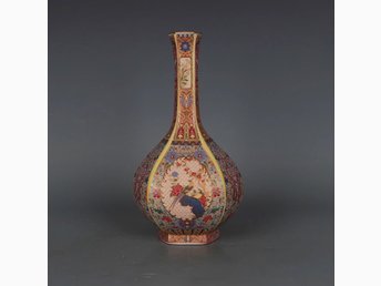 Qianlong emalj blomma och fågel sexkantig vas antik hantverk porslin prydnad