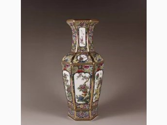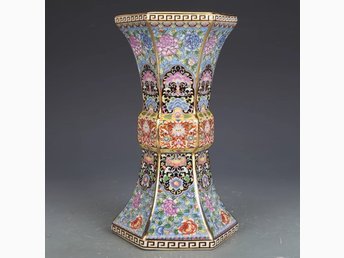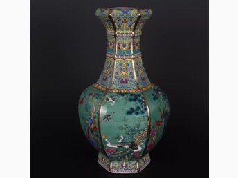 Imitation Qing Qianlong sexkantig vas i emalj, 28 cm hög