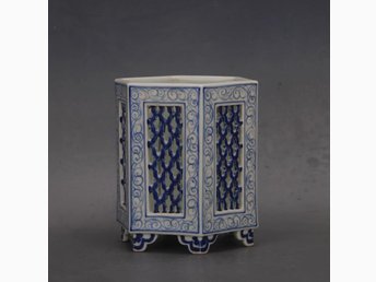 Qianlong år av Qingdynastin blå och vit ihålig sexkantig pennhållare 15,5 cm hög