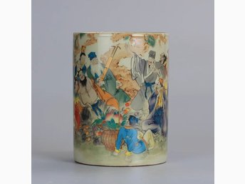 Imitation av Qing Tongzhi figur Eight Immortals keramisk pennhållare, 13 cm hög