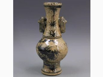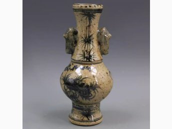 Handmålad antik Yuan blå och vit blomma mönster med öra uppskattning vas
