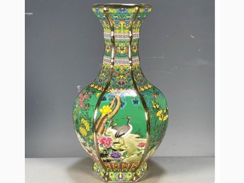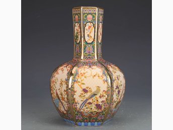 Qianlong emalj blomma och fågel mönster sexkantig vas prydnad, 26 cm hög