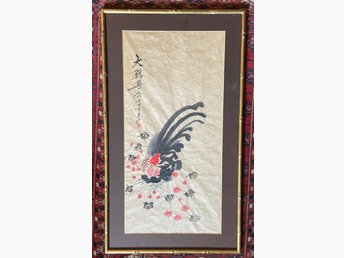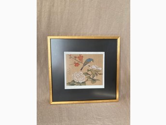 Vintage vacker asiatisk sidenmålning sidenmåleri fågel blommor tavla Japan Kina