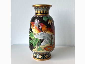 Cloisonné, mycket detaljerad vas med fåglar och blommor, Kina