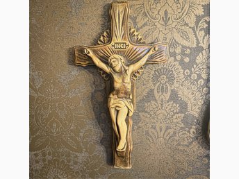 Äldre stort krucifix. Stengods. 1900-tal. Jesus. Kors. Religon. Blackmetal