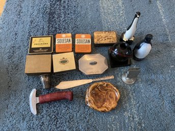 Parti diverse mestadels äldre kuriosa bl.a plåtaskar, pingviner, askfat, verktyg