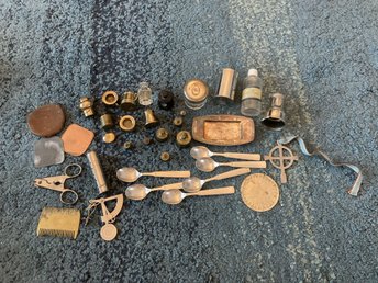 Parti diverse mestadels äldre kuriosa småsaker i metall bl.a vikter och skedar