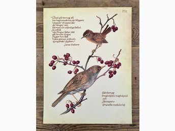 Äldre naturbild Gärdsmyg Järnsparv Hagtorn Fåglar Trädgård Vinter Skolplansch