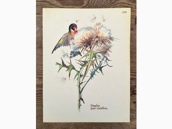 Äldre naturbild Steglits äter tistelfrön Trädgård Inredning Skolplansch