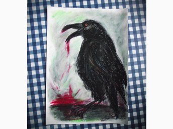 KONST/äkta teckning i pastellkrita - "..ätande KORP......" fågel