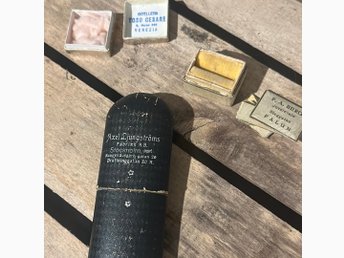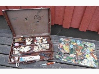 Målarlåda / konstnärslåda med palett och oljefärger; från 50 talet