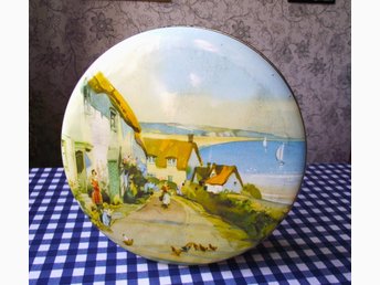 RETRO - 1 st äldre PLÅTBURK med "Engelskt småstads-motiv" hav/stugor