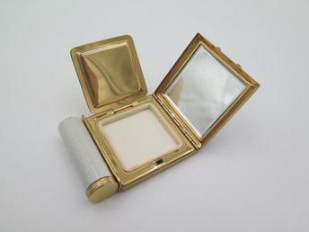 Puderdosa med Läppstifts Behållare, Emaljerad, Guld Metall, Vintage, USA