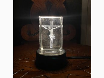 Äldre krucifix i glasblock med lampa. Jesus. Kors. Religon. Blackmetal