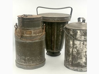 Rustika metallkärl / kannor / mjölkkanna – industriell vintage – set om 3 st