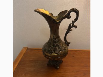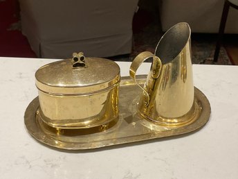 Vintage uppsättning i mässing,en grädd och sockerset) på en bricka. Handarbete