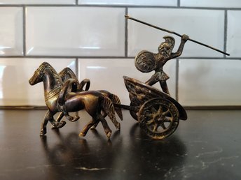 Antik Vagn med Hästar och Krigare i mässing/brons