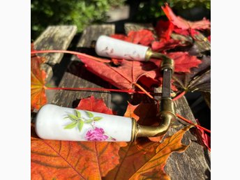 Trycke porslin 1960-tal rosdekor mässing vintage retro dörr handtag