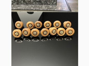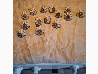 Möbelknoppar i trä med blomma av metall 13 st