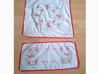 Retro! 2 äldre juldukar broderade handbroderade GodJul tomtemotiv rött kantband