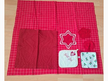 Retro!set 7st diverse jultextilier, röd rutig julduk, grytlappar, virkade dukar