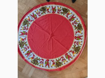 Retro! äldre mellanstor bordsduk julduk med tryck 77x88 granris klockor röd kant