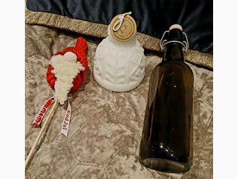 Handgjort ljus Ljuseri Gustavsberg, virkad blompinne tomte, glasflaska