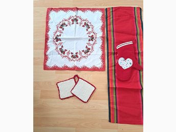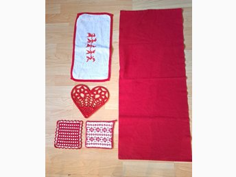 Retro! Div jultextilier röd löpare,virkat hjärta, liten broderad duk, grytlappar