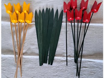 Retro! 13 st trä tulpaner på skaft med blad röda och gula till jul & påsk