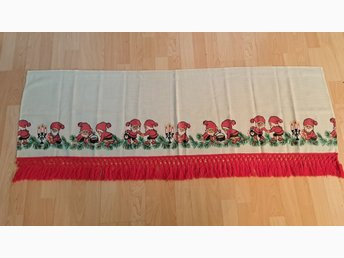 Retro gardinkappa julgardin med tomtar tomtenissar och röd frans