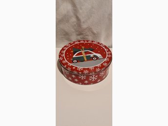 Rund plåtburk med Julmotiv.20 cm I diameter. 7 cm hög.