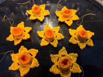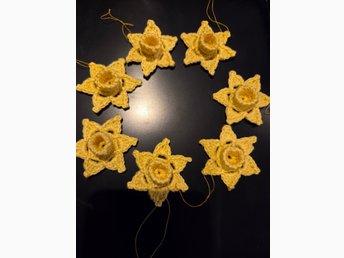Inredning, pynt till påskris, 7 virkade påskliljor/narcisser, merc bomullsgarn.
