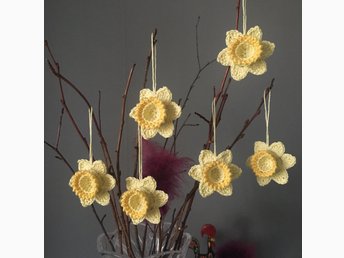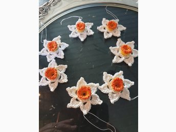 Inredning, till påskris, 7 virkade narcisser pingstliljor, merc bomullsgarn.