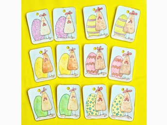 12 Handmålade Påsk Tags Mini Kort Etiketter Akvarell Höna Ägg Easter Hen Egg