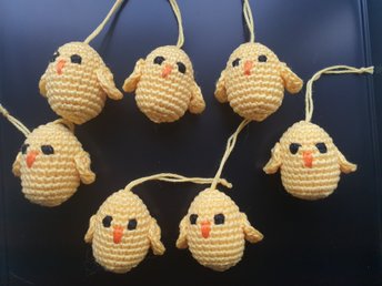 Inredning pynt till ris, 7 st gula kycklingar/fåglar, bomullsgarn.