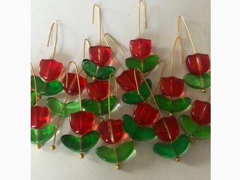 15st Glasblommor. Röda tulpaner med löv. Hänge i guldfärg. Dekoration