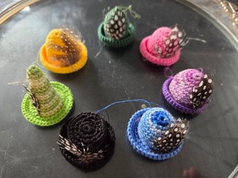 Inredning, pynt till påskris, 7 virkade hattar med fjäder, merc bomullsgarn.