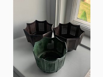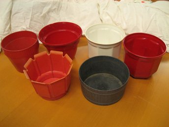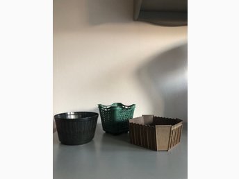 Tre retro ytterfoder ytterkrukor blomkrukor av plast. Rosellplast Design SBA.