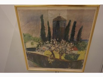 IVAR IVARSSON REPRODUKTION OLJEMÅLNING KYRKA FRUKTTRÄD I GLAS O RAM TAVLA