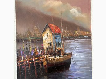 Oljemålning med lite impasto | vy för båt och hus