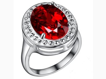 Silver Ring - Stor Oval Röd Kristall & Fint Mönster - Silverpläterad -Stl 18,2
