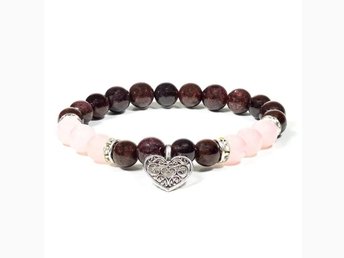 Granat och rosenkvarts, armband med hjärtberlock, 8 mm pärlor