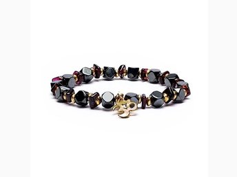 Hematit/granat fasett armband med Aum, elastiskt, 5 mm